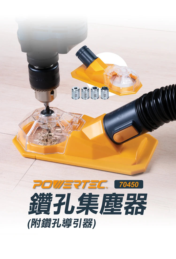 還在為鑽孔後的粉塵煩惱嗎?POWERTEC 70450 鑽孔集塵系統結合吸力底座與導引襯套,能有效捕捉 MDF、膠合板與乾壁粉塵。專為牆面與天花板設計,讓您在保持工作區域乾淨的同時,鑽出 100% 精準的孔洞。
