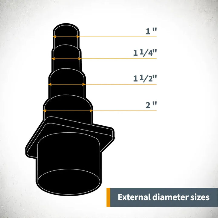 此轉接頭的外徑範圍為 1 至 2-1/2 英寸,可自訂安裝到任何吸塵器的標準軟管端。它還可以自行切割成定制的獨特和不同直徑,為您提供適用於大多數品牌的多功能工具。