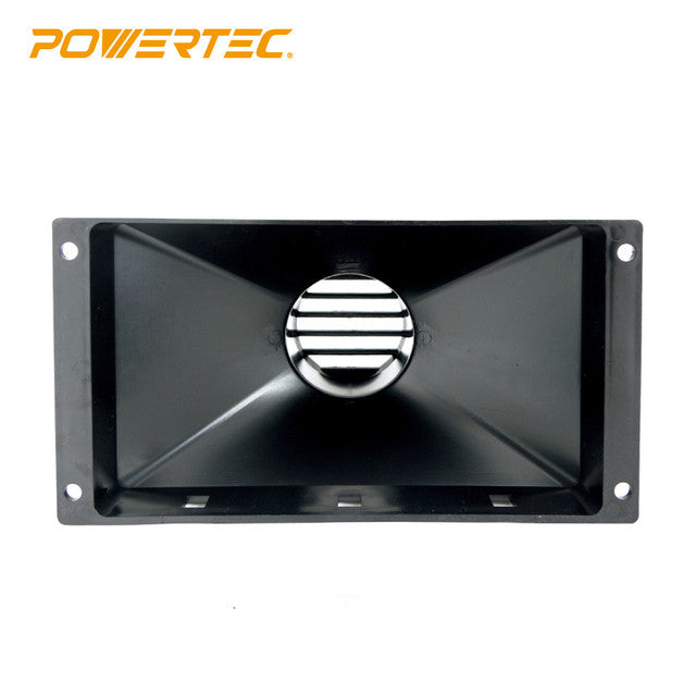 The POWERTEC mini gulp dust hood is the perfect solution for catching dust, chips and debris from your machines. It can be used on your chop saw, table saw, lathe, drill press and other machines. Just place it behind, underneath, or wherever is convenient on your machine. Mounting flange has pre-drilled holes for you to use when attaching your device. Measures 13-1/2” x 7-1/4” with a 4” dust hose port. Flange is 7/8” wide.  The 4” dust port has a built-in guard. Measured Dimension: Nominal end: 4” port (O.D.3-57/64” to 4” flexible hose.) Inside dimension of hood opening: 6-15/16" x 11-3/4"