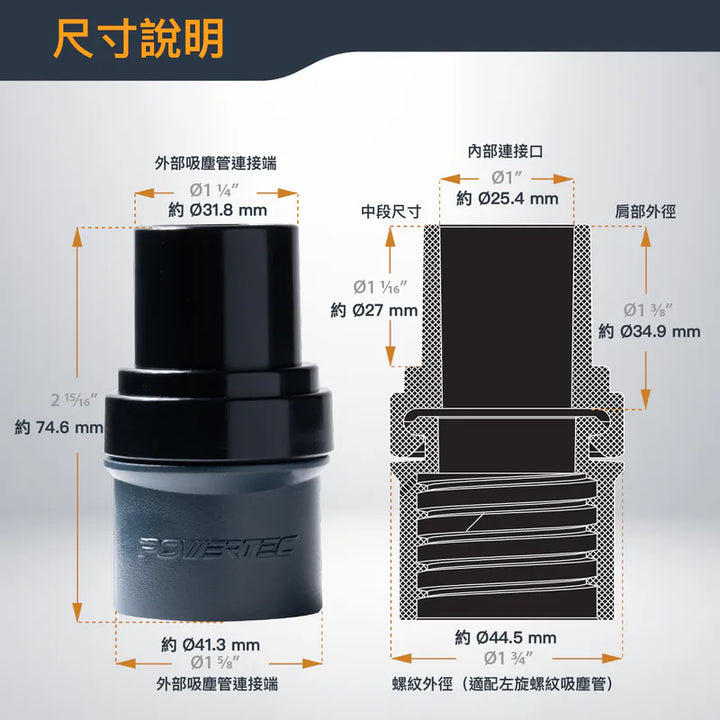 POWERTEC 吸塵管轉接頭 70463|雙件式設計|適用1-1/4"左旋螺紋吸塵管|ABS+PVC材質