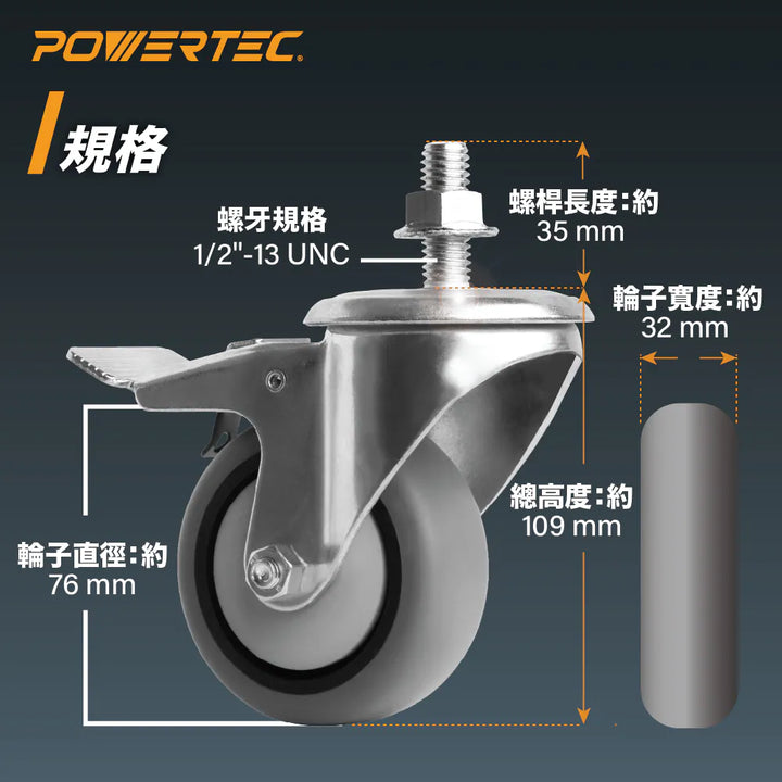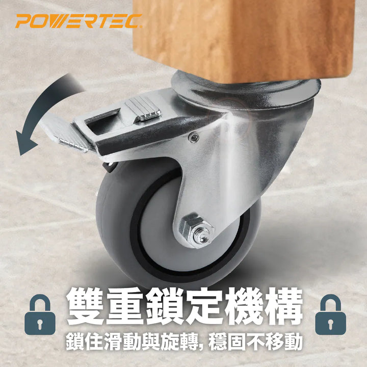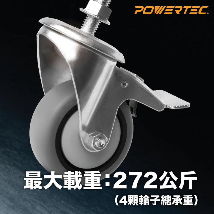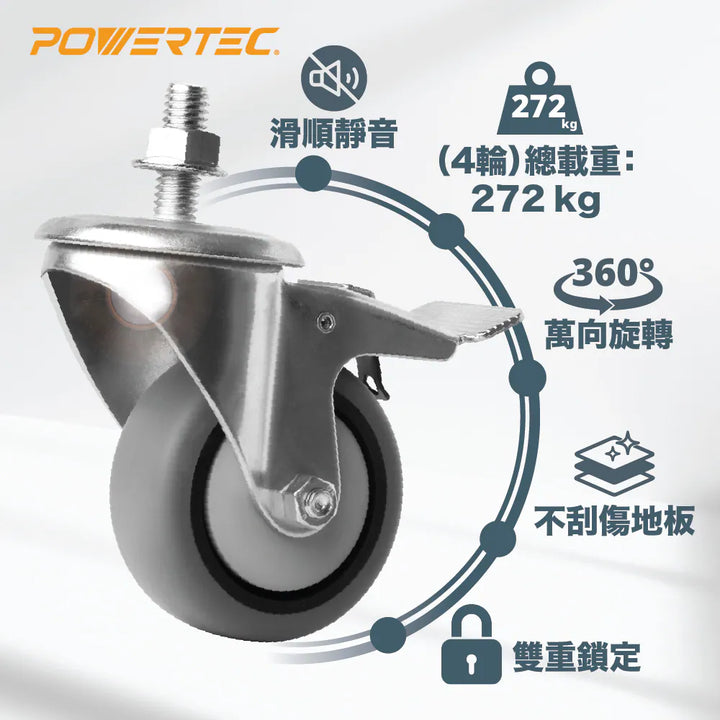 POWERTEC 17201 3吋雙鎖定重型腳輪組(4入)|TPR防刮輪|萬向旋轉|螺紋桿鎖定設計