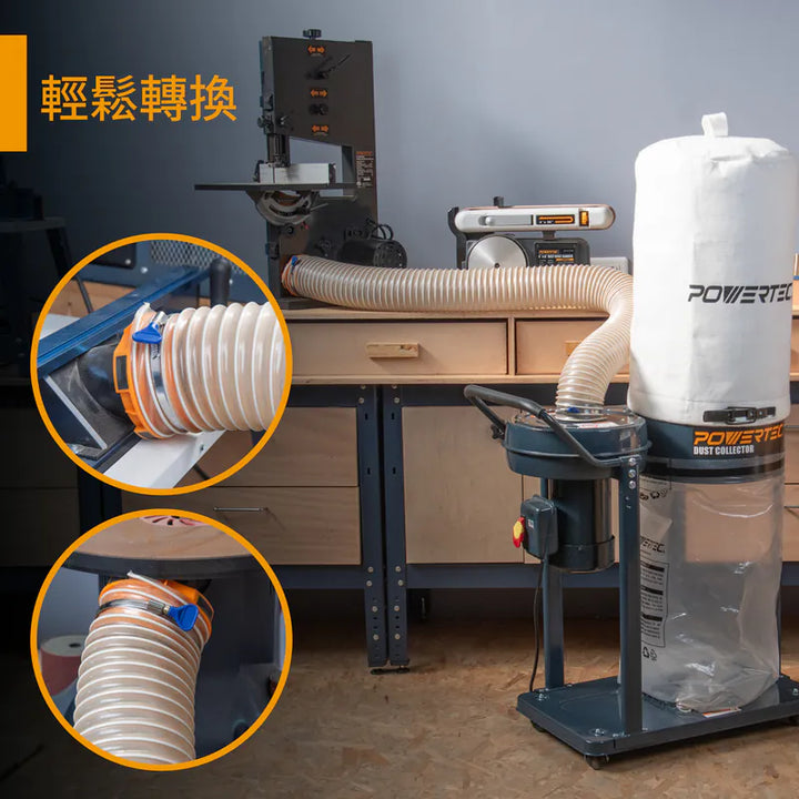 適用於鋸台、砂帶機、刨床和打磨機等各種工具。具有 POWERTEC 的特殊顏色編碼,使您能輕鬆識別和存儲您的工具。現在,您可以輕鬆快速地進行工作,無需擔心集塵管的重新連接問題。
