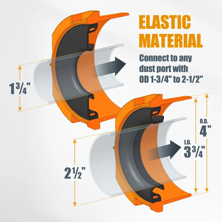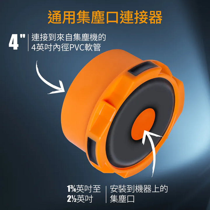 - 多功能設計:適用於 4 英寸(約10.16 公分)內徑的集塵軟管,彈性接口適用於 1-3/4 英寸(約4.45 公分)到 2-1/2 英寸(約6.35 公分)不等的連接端口。