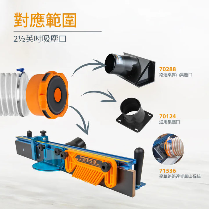 POWERTEC 快速連接集塵工具轉接口,是您應對集塵系統中工具更換的理想選擇。這款轉接口附有一個 4 英寸(約10.16 公分)直徑的集塵口轉接器,讓您輕鬆實現工具間的快速切換,無需斷開和重新連接軟管。