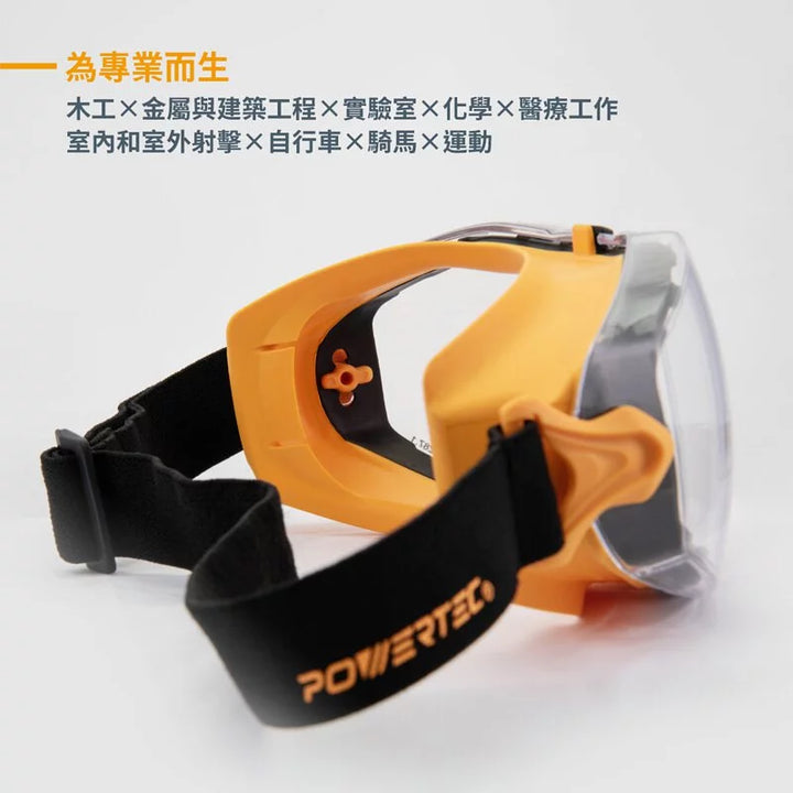 POWERTEC 高品質台灣製造防護眼鏡為您提供全方位的眼部防護,適合各類工作環境。其符合人體工學的設計,不僅能舒適貼合臉部形狀,亦能在配戴近視或防護眼鏡的情況下輕鬆使用,並且提供全景視野,確保無死角的最佳保護。無論在室內或室外使用,都能讓您擁有清晰的視野與安全防護,輕鬆完成工作。適用於木工、建築、實驗室作業、室內外裝修等多種場合。
