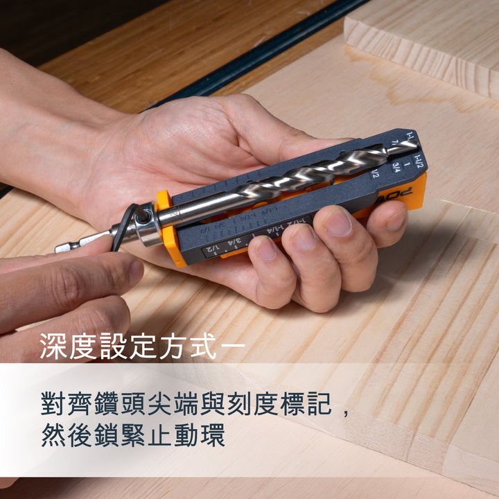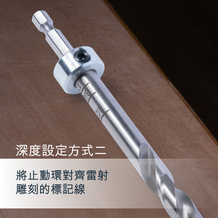 內含3/8 吋高速鋼鑽頭,具備雷射深度刻度,搭配止動環輕鬆鎖定所需深度,完全不需額外量測工具。整組配件齊全,含主體、鑽頭、起子頭與六角扳手,開箱即用。