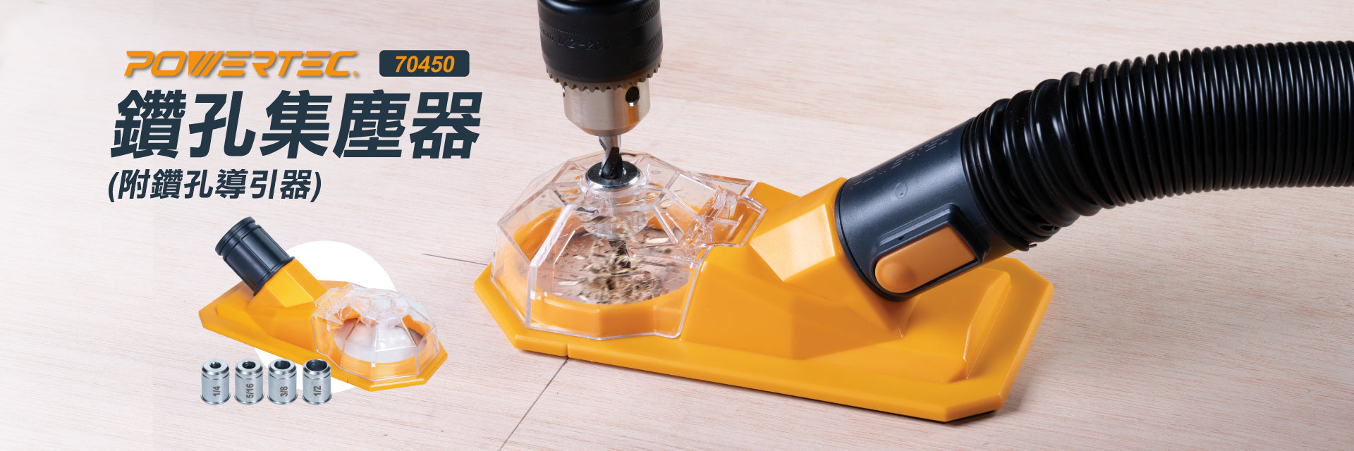 還在為鑽孔後的粉塵煩惱嗎?POWERTEC 70450 鑽孔集塵系統結合吸力底座與導引襯套,能有效捕捉 MDF、膠合板與乾壁粉塵。專為牆面與天花板設計,讓您在保持工作區域乾淨的同時,鑽出 100% 精準的孔洞。